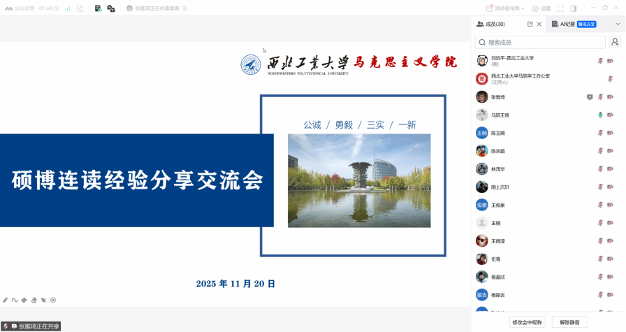 于11月20日举办线上硕博连读经验分享交流会。本次会议以“朋辈引领+政策解读”为主线,通过经验分享、政策剖析为学子们搭建高效互动、共同成长的交流平台,助力学生在学术深造的道路上行稳致远。硕士辅导员王换、研究生培养秘书肖妮及限制级学生共同参与,会议由王换主持。