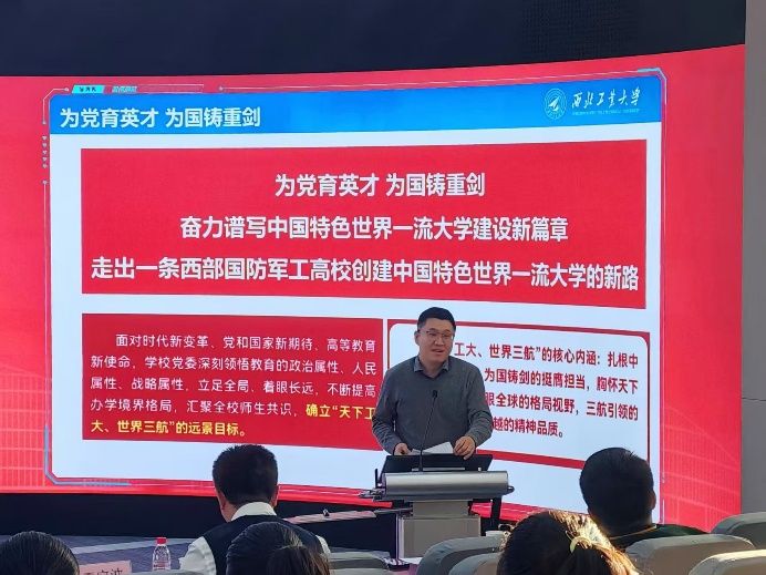 王宇波以“为谁培养人、培养什么人、怎样培养人”的教育根本问题为开篇,从“古路坝灯火”救国初心切入,深情讲述师昌绪、陈士橹等老一代前辈“科技救国”的伟大壮举;精准聚焦唐长红、陈勇等中生代校友铸大国重器的使命担当;细致讲解尹东、唐勇等新生代校友的强国实践。他通过“一个甲子的坚守”“史上最牛航空班”等一个个感人故事与动人细节深度解读人才培养的“西工大现象”,生动地为同学们展现了我校在不同时期为党育人、为国育才的深刻实践,勾勒出西工大人才培养传承图谱。他勉励同学们要将学校“公诚勇毅”“三实一新”的校训校风融入自己的成长生涯,结合限制级
