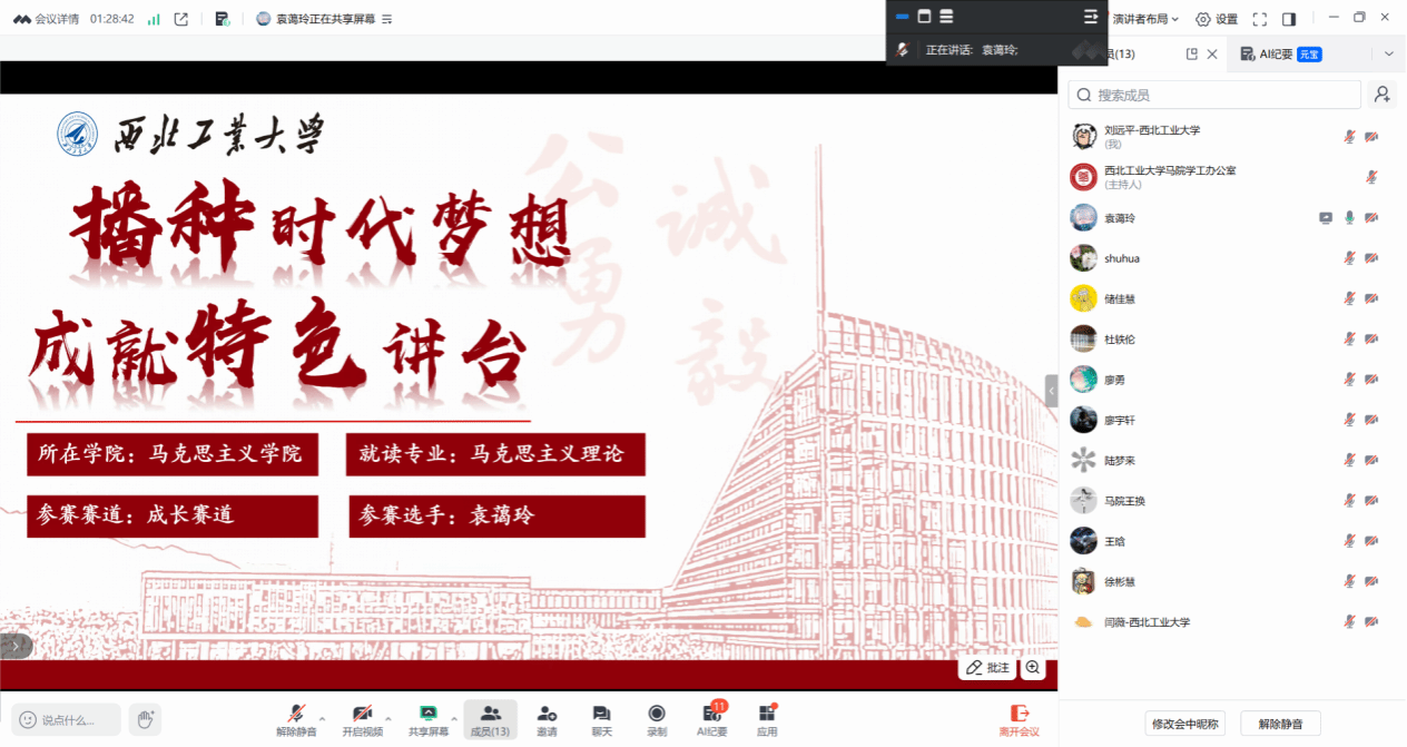 本次选拔赛设置成长赛道与就业赛道,7名马克思主义理论专业学子分赛道同台竞技。选手们的职业规划方案兼具思想深度和实践价值,充分展现了青马学子的理想追求与综合素养。成长赛道4名学子职业规划兼具理想与务实。桂志森聚焦马理论研究与教学,拟深耕社科学术厚土并打造工科特色思政课堂;袁蔼玲以高校思政课教师为目标,展现扎实功底与教学反思;徐彬慧创新“快板+中华优秀传统文化+实践传播”模式,规划职业发展路径;陆梦来结合自身特质,聚焦马克思主义中国化时代化等领域研究。