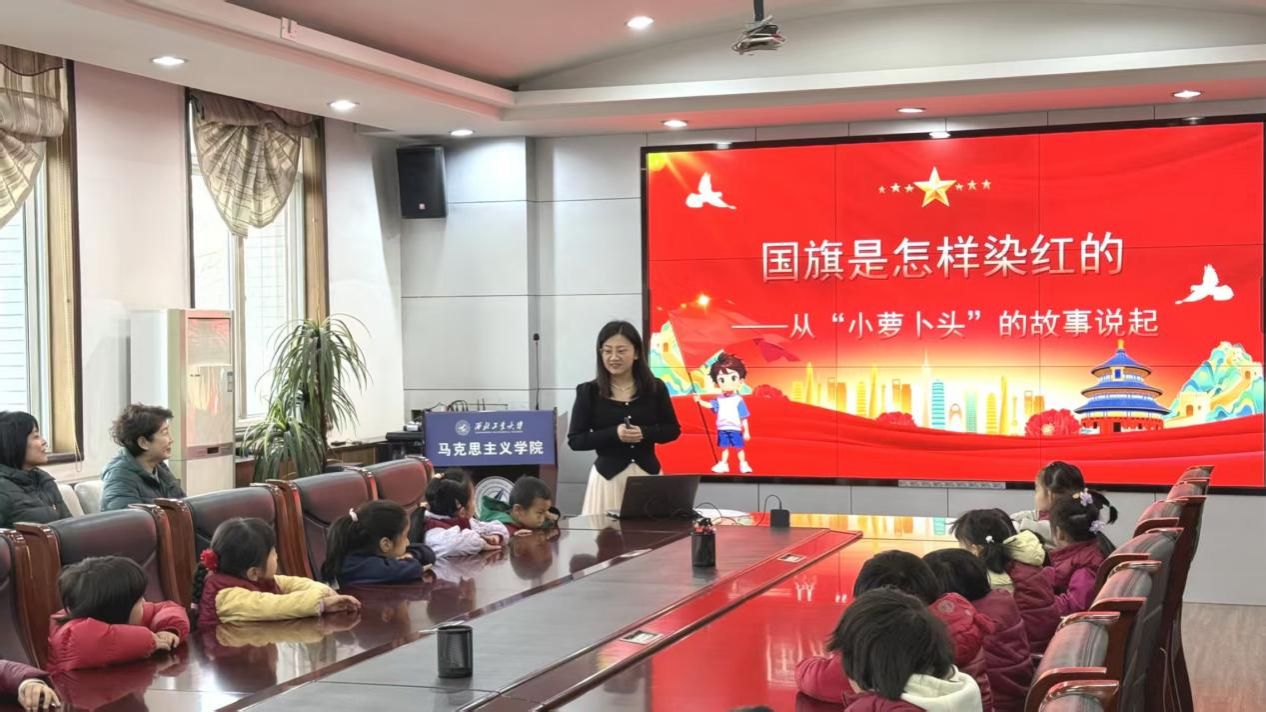 活动伊始,限制级公共课教学秘书张笑男作为家长代表以“小萝卜头”宋振中的革命故事为切入点,用童趣化的语言、形象生动的讲述,向南山幼儿园大班小朋友们解读了五星红旗的组成与象征意义。通过对比“小萝卜头”在狱中艰苦的学习生活与小朋友们当下幸福的幼儿园时光,让孩子们直观感受革命先烈为新中国成立所付出的牺牲与奉献,理解国旗红色的深刻内涵,引导孩子们从小爱护国旗、尊敬国旗,萌发爱国情感。课堂上,小朋友们认真聆听、积极互动,对红色故事充满好奇,爱国种子在潜移默化中生根发芽。