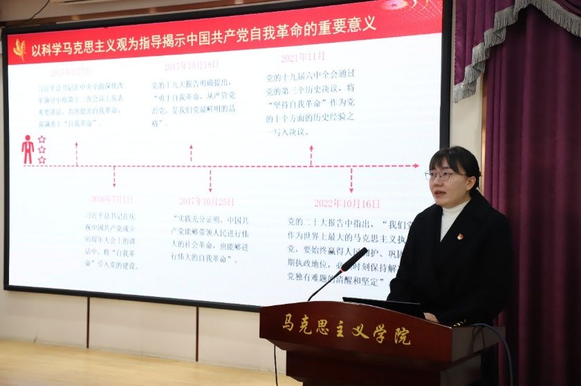 马克思主义基本原理教研室李沛莉老师讲授《以科学的马克思主义观为指导推进党的自我革命》主题微课,从理论与实践层面解读新时代廉洁文化建设的内涵与要求。微党课内容翔实、案例鲜活,引导在场青年学子进一步树立廉洁意识,筑牢拒腐防变的思想道德防线。