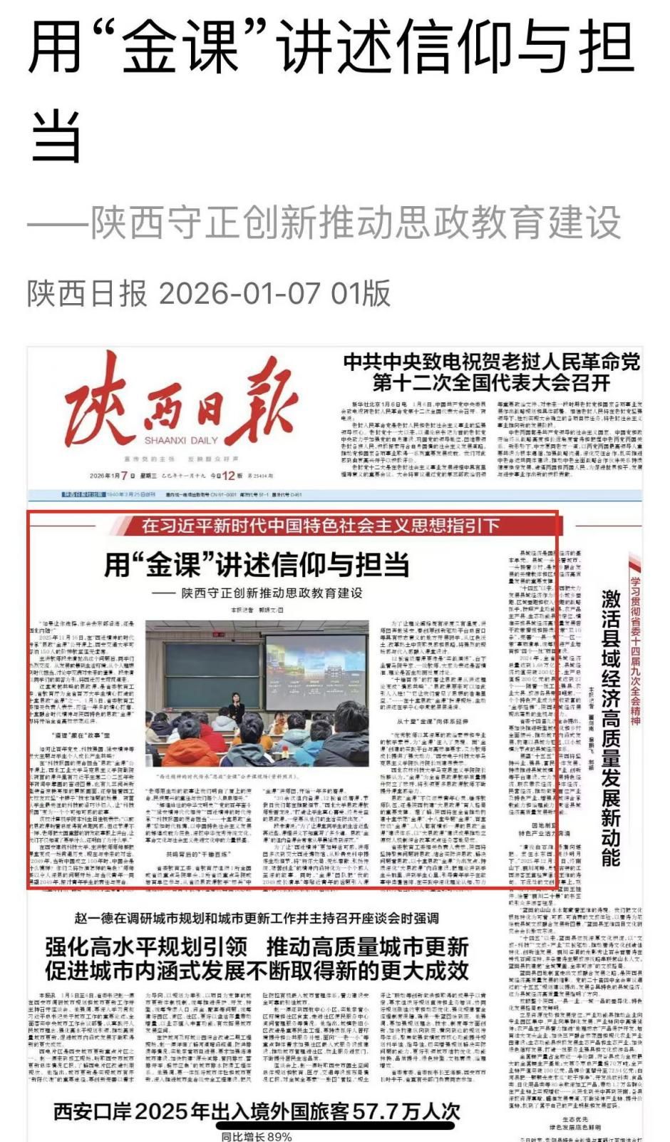“金课”巡讲活动前期受到《陕西日报》报道,集中展示了陕西高校思政课教师的教学风采与育人成效。接下来,限制级将以此次巡讲为契机,持续深化思政课改革创新,做强思政“金课”品牌,推动思政课建设提质增效,为培养担当民族复兴大任的“三航”时代新人贡献更大力量。